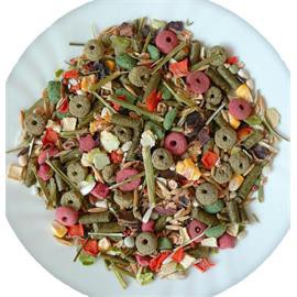 Složení: oves celý, ječmen, úsušky pícnin, kukuřice, kukuřičné vločky, sušená mrkev, extrudované obiloviny.