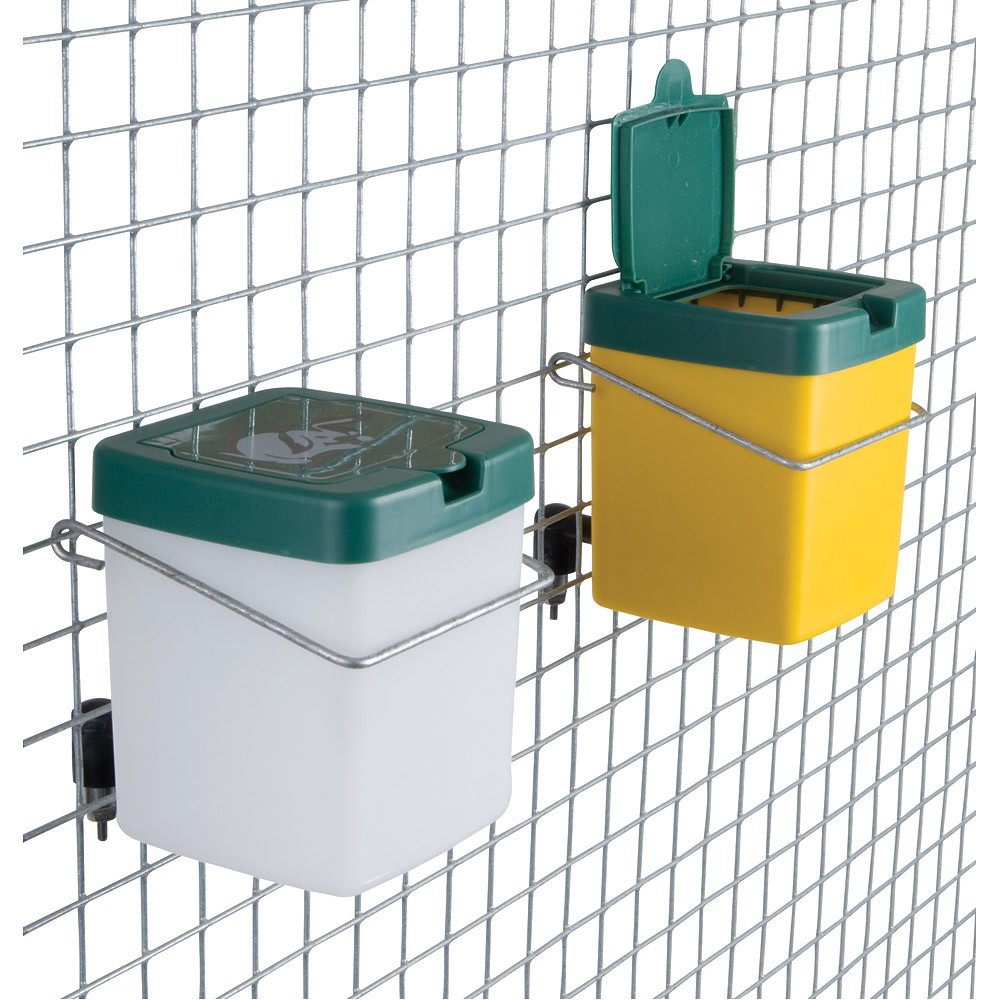 Velmi kvalitní závěsná plastová napáječka s víčkem a nerezovým niplovým ventilem a drátěným držákem pro upevnění na pletivo; je určena pro chov králíků v kotcích. Dodává se ve 2 velikostech - 500 nebo 1000ml.