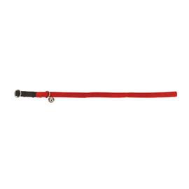 Červený obojek pro kočky s rolničkou a gumovou vsadkou. Délka 30 cm, šíře 1 cm.