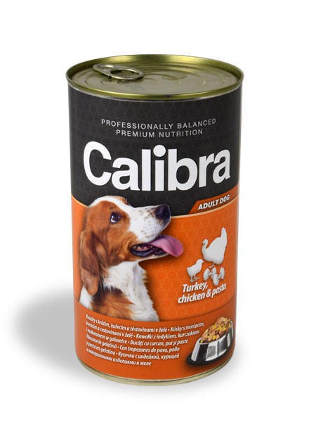 Kompletní krmivo pro dospělé psy s kousky krůtího a kuřecího masa a těstovin v želé. Calibra konzervy jsou určeny pro dospělé psy. Receptury s vyváženou kombinací, masa, těstovin a obilovin a zeleniny v želé vyhoví různým chutím psích strávníků. Konzervy Calibra obsahují kromě důležitých vitamínů, minerálů i inulin, který má probiotické účinky. Nenajdete v nich sóju, geneticky modifikované suroviny, umělá barviva ani chemické konzervanty. Složení: maso a výrobky živočišného původu min. 33 % (5 % krůtí, 5 % kuřecí), obiloviny, pekařské výrobky (5 % těstoviny), bílkovinné extrakty rostlinného původu, minerální látky, vedlejší výrobky rostlinného původu (0,2 % inulin), cukry. Analytické složky: Vlhkost 80,0 % Hrubý protein 8,0 % Hrubé oleje a tuky 5,0 % Hrubý popel 2,5 % Hrubá vláknina 0,5 %