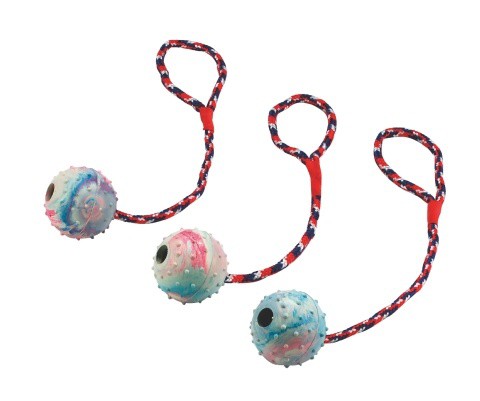 Házecí gumová hračka na laně s rolničkou. Délka lana 30cm