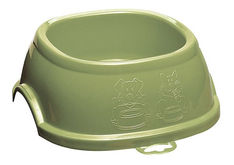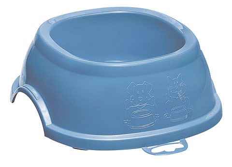 Plastová miska na jído nebo vodu. Protiskluzové provedení. Dodává se v modré nebo zelené barvě.