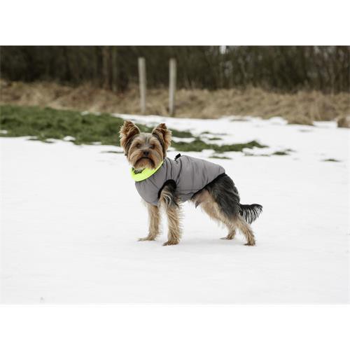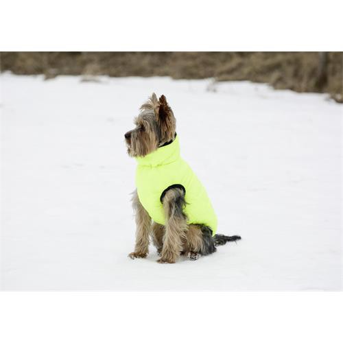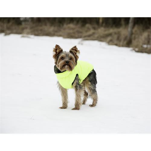 Módní prošívaný kabát pro psy vhodný na chladné podzimní, zimní a jarní dny. Jedná se oboustranně použitelný obleček, kde na jedné straně je použitá výrazná žlutá barva a na druhé straně je šedá barva. Obleček je vyrobený z polyesteru a vyplněný teplou výplní pro zajištění dostatečného tepla v chladném počasí. Na hřbetu je silný plastový zip a jsou zde očka pro uchycení vodítka.