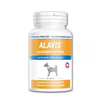 Intenzivní výživa kloubů ALAVIS™ Kloubní výživa obsahuje látky Glukosamin sulfát a chondroitin sulfát, což jsou látky, které se řadí do skupiny tzv. glykosaminoglykanů (GAG). Tyto látky tvoří přirozenou součást kloubní chrupavky a kloubní synoviální tekutiny. Jejich úbytek se projeví ve zhoršení funkce kloubu a v urychlení rozvoje artrotických změn. Z přípravkuALAVIS™ Kloubní výživa se tyto látky snadno vstřebávají a vestavují do poškozené chrupavky. Jejich dostatečný přísun zabezpečuje dlouhodobě správnou funkci chrupavky, její pevnost, pružnost a odolnost. Mechanismus účinku těchto látek je společný a spočívá v chondroprotektivním působení. Účinné látky jsou přítomny v potřebném množství a navíc v koncentrované podobě. ALAVIS™ Kloubní výživa dlouhodobě zabezpečuje pevnost, pružnost a odolnost kloubní chrupavky. Velikost balení: 90 tablet Dávkovací tabulka: Hmotnost psa: Iniciační dávka (prvních 14 dní): Udržovací dávka (pokračovací): 1 – 5 kg 1 tableta 1 / 2 tablety 5 – 10 kg 1,5 tablety 3 / 4 tablety 10 – 25 kg 2,5 tablety 1 tableta 25 – 45 kg 3 – 3,5 tablety 1,5 tablety 45 a více kg 3,5 – 4,5 tablety 2 – 2,5 tablety Způsob použití: Tablety se podávají denně dle doporučeného dávkování přímo do tlamy nebo s kouskem potravy, event. rozdrcené do krmiva. Přípravek zvířata obvykle přijímají bez problémů. Délka užívání: Přípravek podávejte optimálně tři měsíce, potom udělejte 1 – 3 měsíce pauzu a přípravek opět nasaďte. Upozornění: Přípravek je možné podávat s krmivy obsahujícími chondroprotektivní látky. Pozitivní účinek se tak zvýší. Při kloubních obtížích je vhodné ALAVIS™ Kloubní výživu podávat společně s přípravkem ALAVIS™ Single.