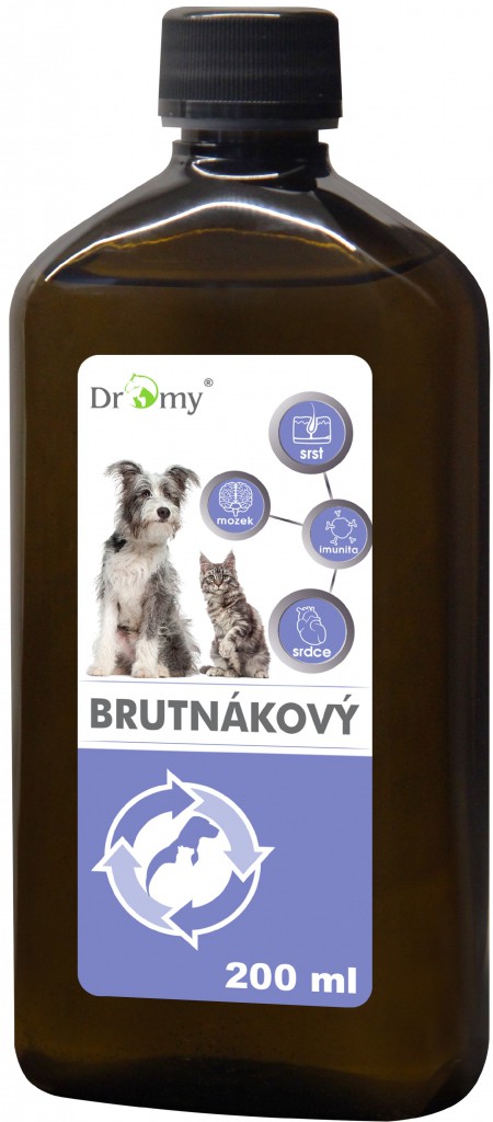 Brutnákový olej pro psy a kočky určený k obohacení krmné dávky o esenciální mastné kyseliny,
