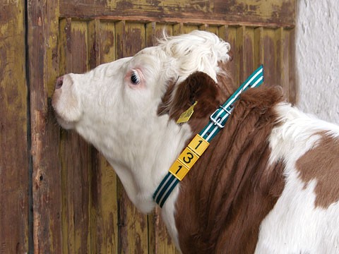 Další varianta řemene používaného pro krční značení skotu tak, že se na něj navlékají plastová čísla s kódy č.481013100-8. Šířka 40 mm, délka 135 cm.
