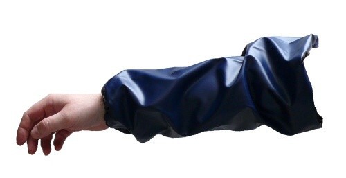 Návleky na předloktí dojiče vyrobené z nepromokavé tkaniny. Rukávce jsou dlouhé 40 cm.