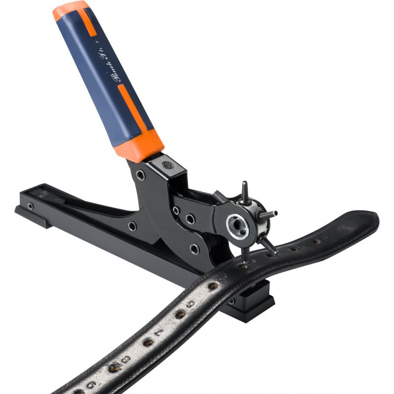 Kovová stolní děrovačka na kůži s odnímatelným upevňovacím zařízením a neklouzavou PVC rukojetí. 6 možných velikostí dírek.