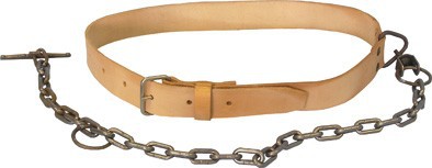 Jednoduchý a levnější vazák pro dojnice s ocelovým řetězem 6 mm o délce cca 85 cm a koženým řemenem 120 cm dlouhým o šířce 4,5 cm.