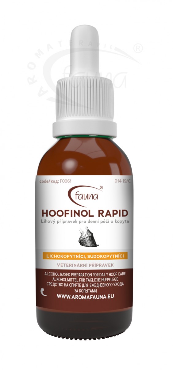 Lihový přípravek s širokým spektrem účinku určený k desinfekci kopyt, použitelný k denní péči. Osvědčil se u kopyt trpících hnilobou. Při akutní „vlhké“ hnilobě dochází během několika dní k zasušení a zastavení procesu změny rohoviny. Líh a éterické oleje působí proti širokému spektru bakterií a plísní. Použití: Aplikujte po očištění kopyt. Pokud zvíře trpí hnilobou kopyt, aplikujte zpočátku 2× denně po očištění kopyt a odstranění změněné rohoviny. Přípravek využijete při péči nejen o koňská kopyta, ale i při ošetřování jiných licho či sudokopytníků (ovce, kozy, skot). Skladování: Uchovávejte při pokojové teplotě. Uchovávat mimo dosah dětí. INCI: Alcohol denat, Thymus vulgaris Oil, Melaleuca alternifolia Leaf Oil, Eugenia caryophyllus Leaf Oil, Euge- nol*, Lavandula hybrida Oil, Thuja occidentalis Leaf Oil, Linalool*, Limonene*, Geraniol* *Alergenní látky rostlinného původu obsažené v éterických olejích Veterinární přípravek, Číslo schválení: 014-19/C