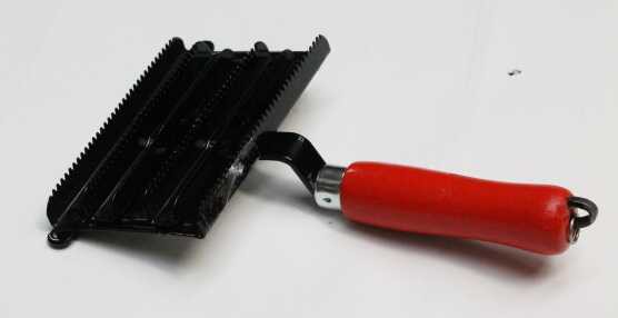 Rovné lakované hřbílko na čistění koní a dobytka s dřevěnou rukojetí, kterým se odstraňují ze srsti hrubší nečistoty.