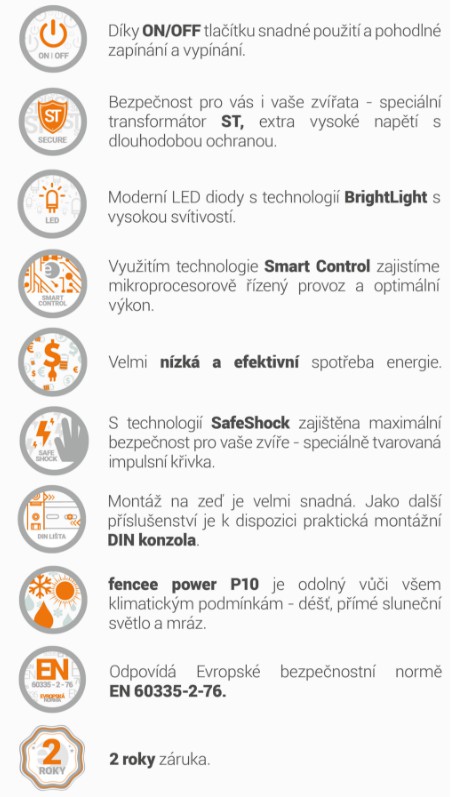 Zdroj fencee power P10 je univerzálně použitelný pro krátké, střední i dlouhé ohrady do 8 km a vhodný pro citlivější i méně citlivější zvířata jako jsou koně, skot, ovce, kozy, drůbež i jako ochrana před zvěří nebo drobnými škůdci. Kompaktní moderní konstrukce ohradníku s vypínačem a nejnovější mikroprocesorovou technologií uvnitř nabízí praktické řešení a umožňuje jednoduchou instalaci. LED kontrolky na přední straně signalizují provoz zdroje i případnou poruchu na ohradníku.