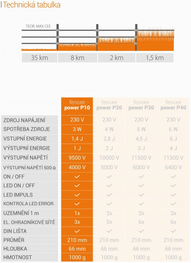 - Zdroj fencee power P10 je univerzálně použitelný pro krátké, střední i dlouhé ohrady do 8 km a vhodný pro citlivější i méně citlivější zvířata jako jsou koně, skot, ovce, kozy, drůbež i jako ochrana před zvěří nebo drobnými škůdci.