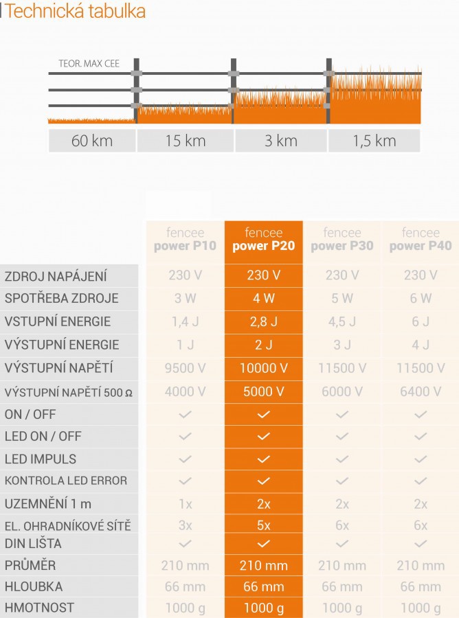 Zdroj fencee power P20 je univerzálně použitelný pro krátké, střední i dlouhé ohrady do 15 km a vhodný pro citlivější i méně citlivější zvířata jako jsou koně, skot, ovce, kozy, drůbež i jako ochrana před zvěří. Kompaktní moderní konstrukce ohradníku s vypínačem a nejnovější mikroprocesorovou technologií uvnitř nabízí praktické řešení a umožňuje jednoduchou instalaci. LED kontrolky na přední straně signalizují provoz zdroje i případnou poruchu na ohradníku.