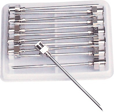 Nerezová Luer Lock injekční jehla k očkování chovaných zvířat pro injekční stříkačky a automaty; dodávají se dle průměru a délky ve 20 velikostech, na objednávku je možné dodat injekční jehly i v jiných rozměrech. Základní balení je 12ks a prodejní cena je za 1ks.
