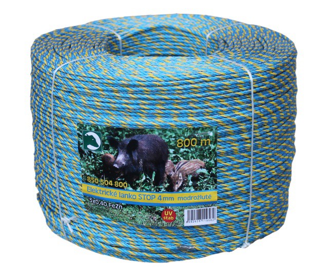 Umělohmotné lanko pro stavbu elektrického ohradníku o průměru 4mm je v modrožluté barvě a používá se zejména na ohradách, které zamezují vstupu divokých prasat na pole, louky, golfová hřiště, parky a pod. jelikož divočáci tuto kombinaci barev dobře vidí a respektují. Lanko obsahuje 3x0,40mm pozinkované dráty a má velmi dobrou vodivost s měrným odporem 0,38 Ω/m i dobrou pevnost v tahu - 200kp. Uvedená cena je za návin 800m.
