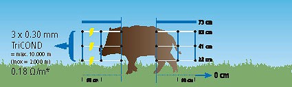 - vodiče: 3 řady TriCOND provaz bílomodrý (3 x 0,30 mm TriCOND vodiče) - zajistí optimální vodivost, délka plotu až 10 000 m