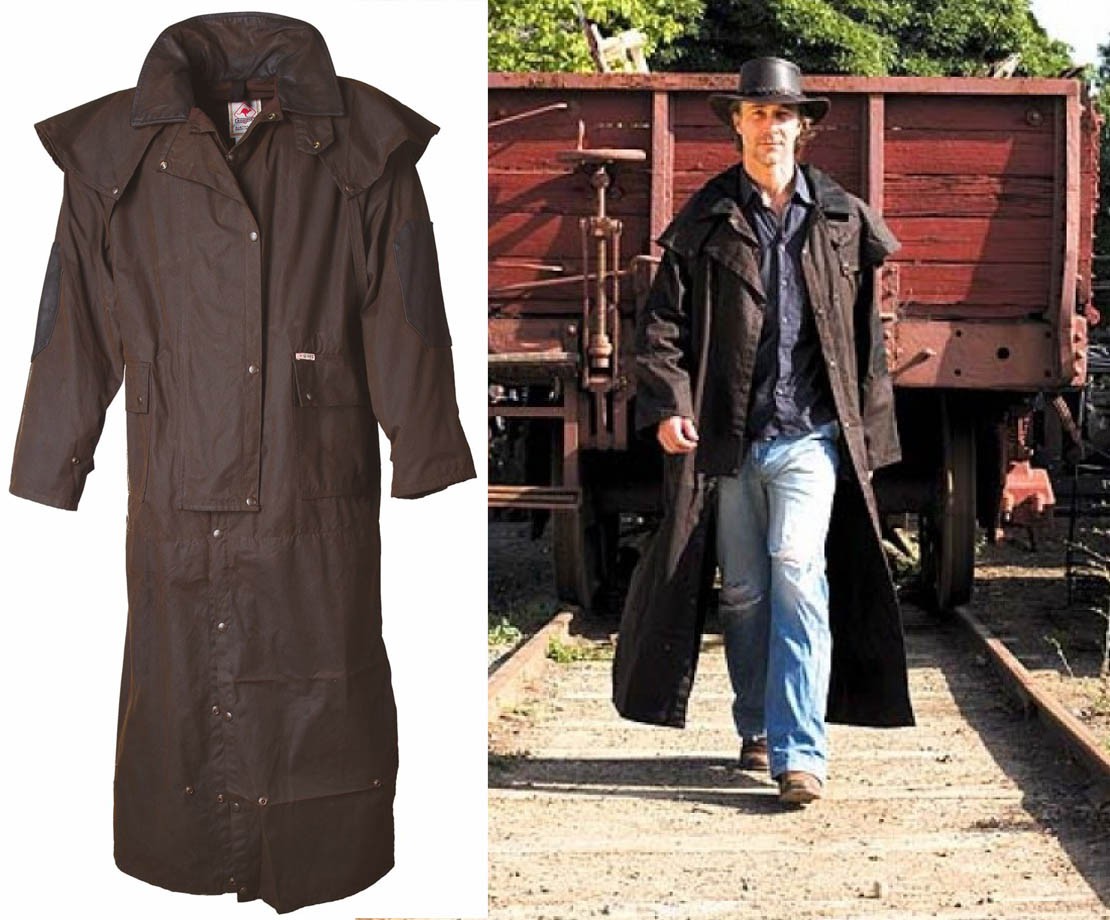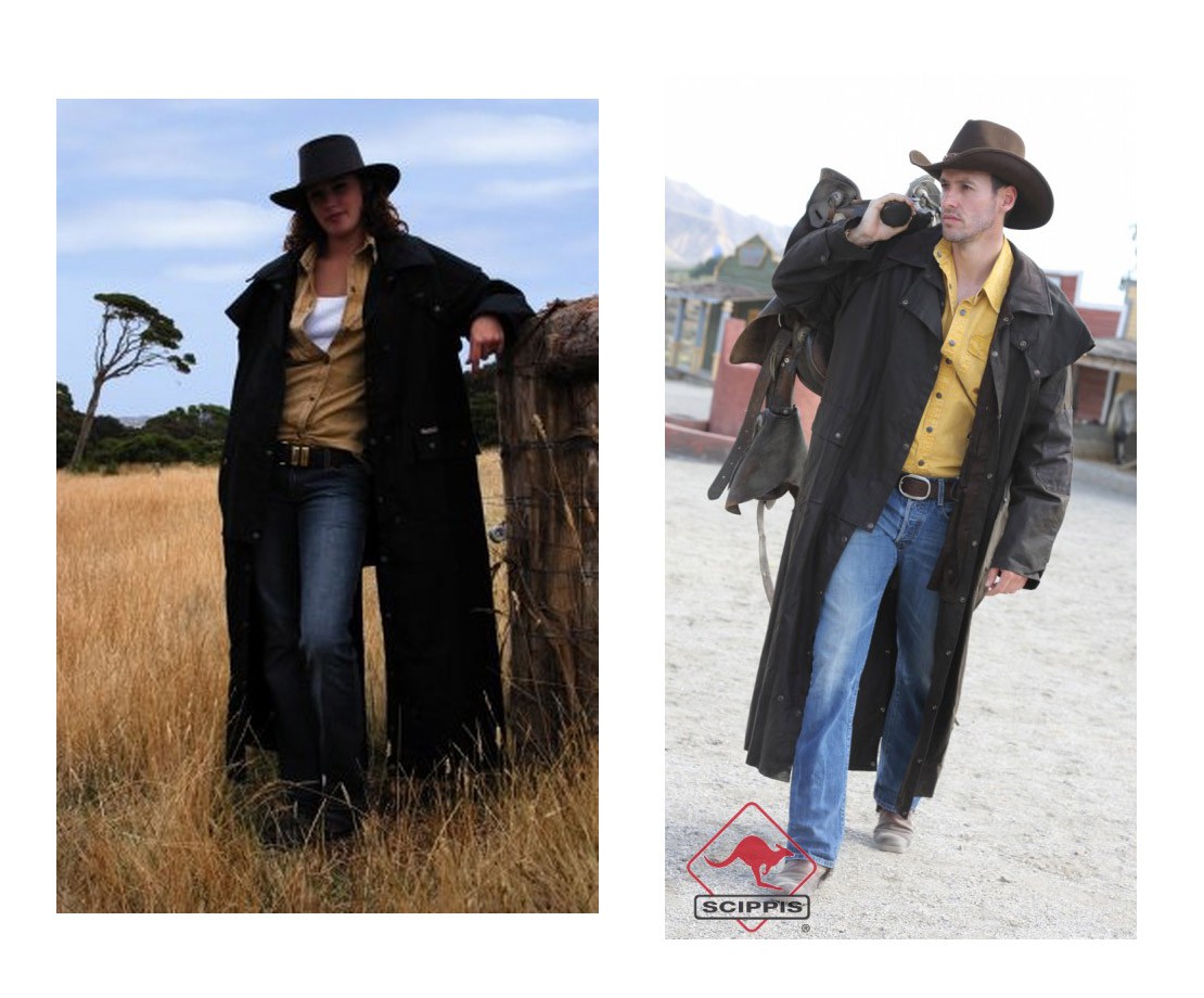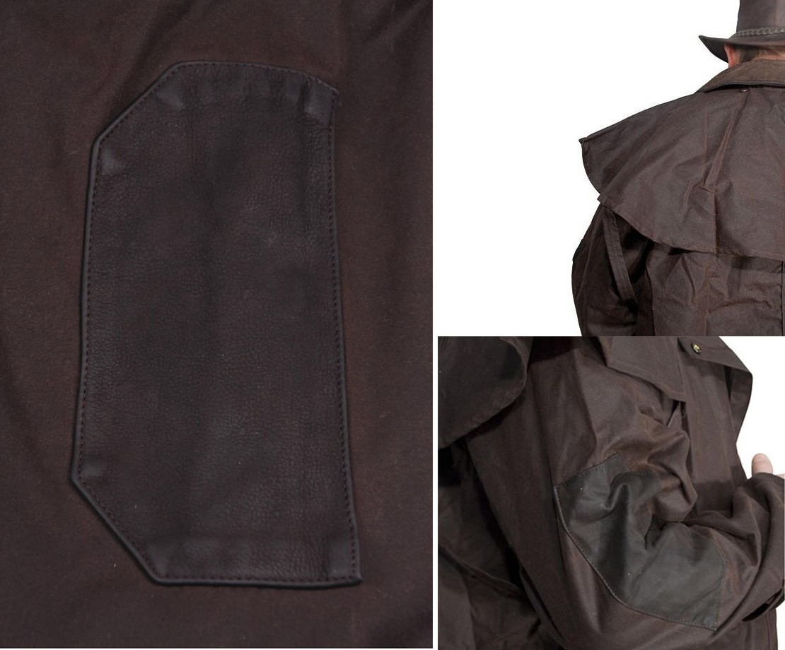 Westernový australský extra dlouhý kabát s odepínací pelerinou a možností změny na 3/4 délku pomocí patentů. Je vhodný pro muže i ženy. Kabát má vysoce kvalitní kožený límec a lokty, dvě multifunkční kapsy, dvě vnitřní kapsy (jedna na zip), lýtkové přezky na patenty, šňůrku na stažení v pase a zadní rozparek.