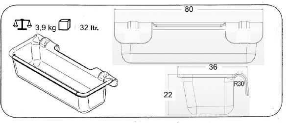 Přenosný závěsný žlab o objemu 32 l. se používá se pro skupinové krmení nebo napájení telat, ovcí, koz a hříbat, dodává se v tmavě zelené barvě; má hmotnost 3,9 kg a rozměry: šířka 80cm, výška 22cm, hloubka 28cm a hloubka závěsů je pak 8cm.